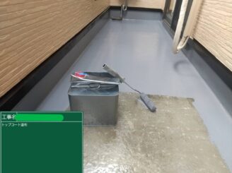 ベランダ FRP防水 トップコート。 FRP防水層を紫外線や摩耗から保護するため、トップコートを施工しました。 防水性能を維持し、ベランダを長く安心して使用できる状態に整えています。