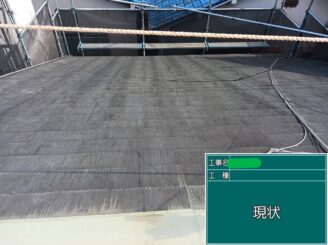 施工前。 施工前の屋根は、塗膜の劣化や色あせが進行しており、防水性能の低下が見られる状態でした。 塗装による保護が必要なタイミングです。