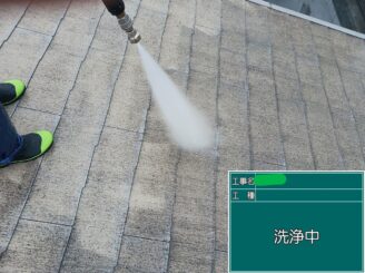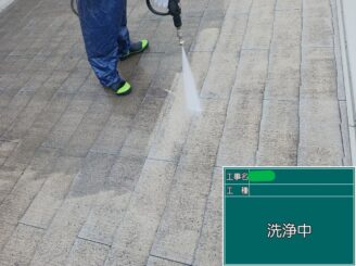 屋根高圧洗浄中。長年蓄積した汚れや旧塗膜の粉化を除去し、下地をリセットします。 これを行わずに塗装すると、密着不良の原因になります。
