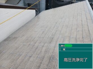 屋根高圧洗浄完了。表面の汚れが除去され、下地の状態が明確になりました。 ここから本格的な塗装工程へ進みます。