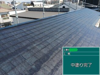 屋根中塗り完了。 塗膜が安定し、紫外線への耐性が向上しました。