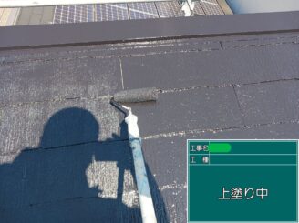 屋根上塗り中。 仕上げ工程として塗膜を均一に整え、防水性能を最大化します。
