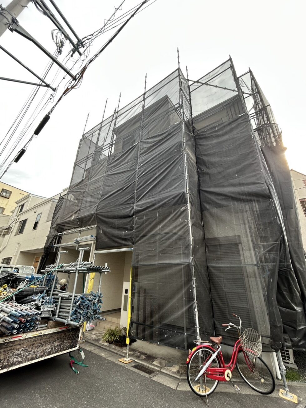 安全に作業を行うため、足場を設置。 近隣の方への配慮も行いながら、養生を徹底して施工を進めます。