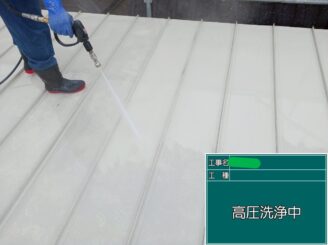 屋根 高圧洗浄中。 屋根表面に付着した汚れ・苔・旧塗膜をしっかり洗い流します。