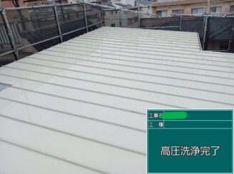 屋根 高圧洗浄完了。 塗料の密着を高めるため、汚れを徹底的に除去しました。
