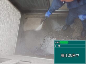 ベランダ 洗浄中。 防水層を傷めないよう、水圧を調整しながら洗浄。