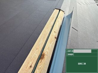 棟板金下地取替工事 新しい棟板金を取り付け、風雨に強い納まりに仕上げます。隙間が出ないよう調整し、屋根の要である棟部分の耐久性を高めました。