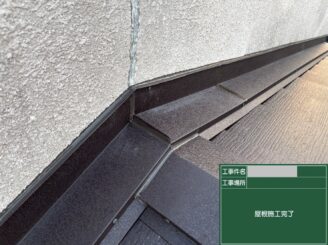 壁際板金工事完了 壁際板金を施工し、雨仕舞(あまじまい)を整えました。壁と屋根の取り合い部は雨漏りが起きやすい箇所のため、確実に防水できるよう仕上げています。