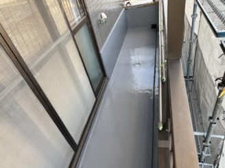 ベランダFRP防水工事完成② 施工後は表面の美観も整い、機能性と見た目の両方を改善しています。定期的なメンテナンスを行うことで、長期間安心して使用いただけます。