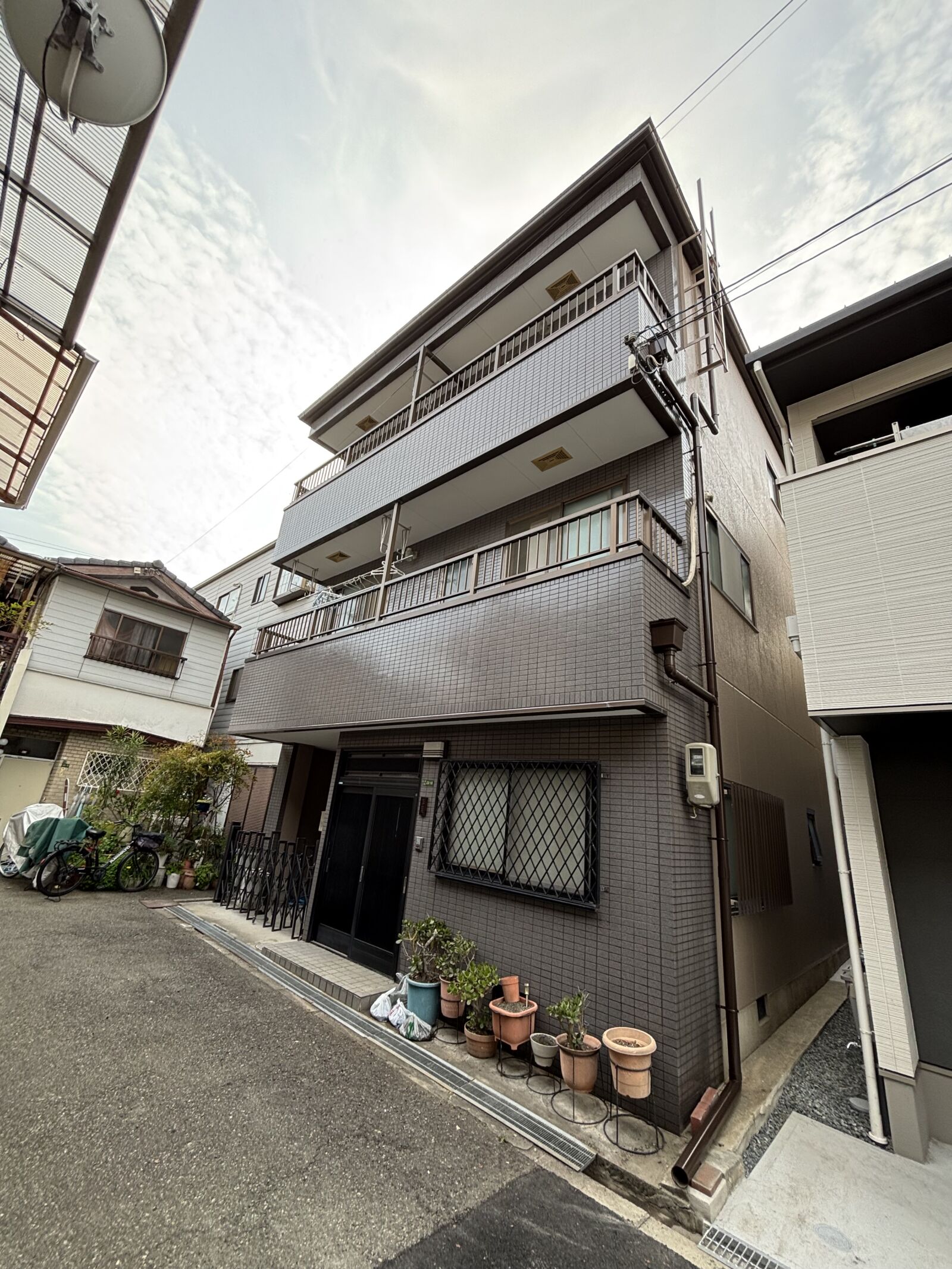 今回の現場は、大阪市大正区の住宅で、外壁の劣化とシーリングの硬化、さらにベランダ防水の傷みが重なっている状態でした。