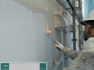外壁中塗り中 塗膜に厚みを持たせ、耐久性を向上させます。