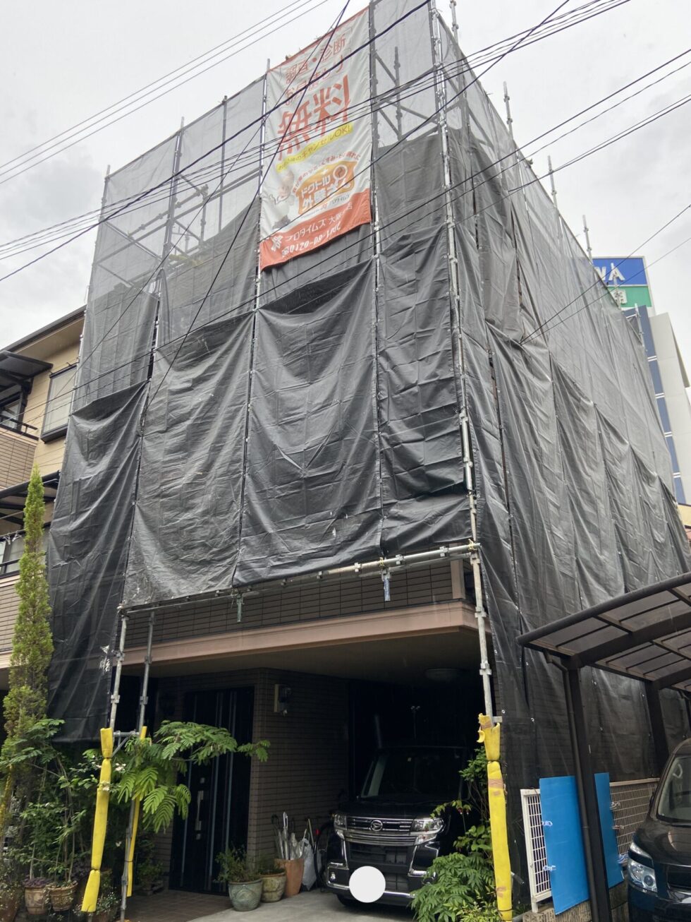 安全かつ丁寧な施工を行うため、建物全体に足場を設置しました。 周囲への配慮を行いながら、作業しやすい環境を整えています。