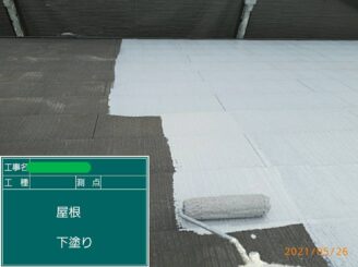下塗り。下塗り材を塗布し、屋根材と塗料の密着性を高めます。 この工程が、塗装の持ちを左右する重要なポイントです。