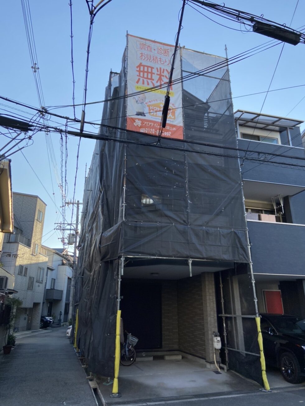 安全かつ丁寧な施工を行うため、建物全体に足場を設置します。 足場は作業の安全性だけでなく、塗装の仕上がり精度にも大きく影響する重要な工程です。