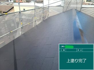屋根上塗り完了。 艶と耐久性が回復し、美観と機能を両立しました。