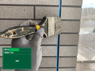 下塗り中。下地強化塗料を塗布し、上塗りとの密着性を高めます。
