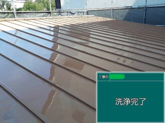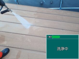 屋根高圧洗浄中。蓄積した汚れや旧塗膜の粉化部分を除去。塗料の密着性を確保するための重要な下地処理です。