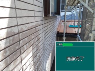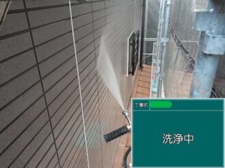 外壁高圧洗浄中。 凹凸部や目地周辺の汚れまで丁寧に洗浄。塗膜の剥離を防ぐための準備工程です。