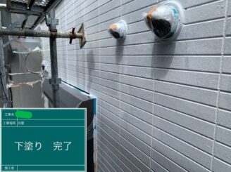 外壁下塗り完了。下地が安定し、上塗り工程に最適な状態となりました。 これにより、塗膜の剥離リスクを抑えます。