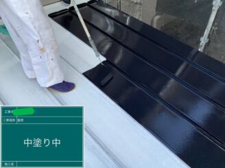 屋根中塗り中。塗膜に厚みを持たせながら、防水性と耐候性を高める層を形成します。 均一な塗布が耐久年数を左右します。