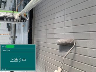 外壁上塗り中。色味を整えながら、紫外線や雨水から外壁を守る最終層を形成します。