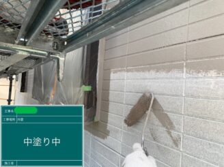 外壁中塗り中。塗膜に十分な厚みを持たせ、防水性を高める層を形成します。 均一な施工が耐久性に直結します。