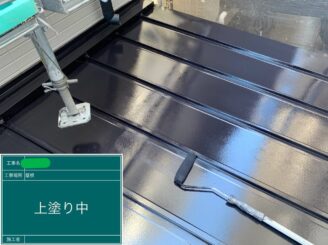 屋根上塗り中。最終仕上げとして保護層を形成し、耐候性能を最大化します。 仕上がりの美観もここで決まります。