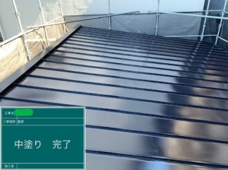 屋根中塗り完了。塗膜が安定し、紫外線への耐性が向上しました。 ここで性能の土台が完成します。