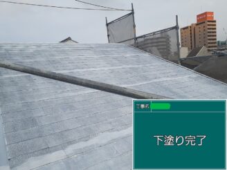 屋根 下塗り完了。 塗料の密着性を高めるための下塗り工程です。