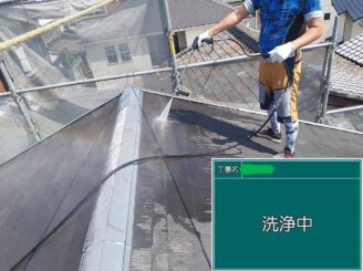 屋根 高圧洗浄中。 屋根表面に付着した汚れや旧塗膜を高圧洗浄でしっかり除去しています。