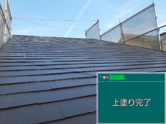 屋根 上塗り。 仕上げ塗装を行い、遮熱性・美観を高めました。