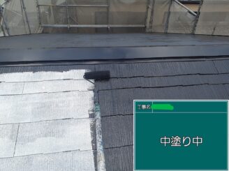 屋根 中塗り。 塗膜に厚みを持たせ、耐久性を向上させます。