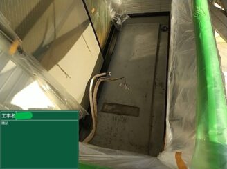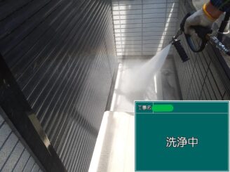 ベランダ床 洗浄中。 ベランダ床の汚れを除去し、防水工事に備えます。