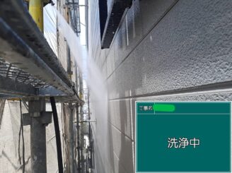 外壁 高圧洗浄中。 外壁に付着した汚れ・カビ・ホコリを洗い流しています。