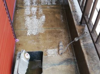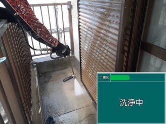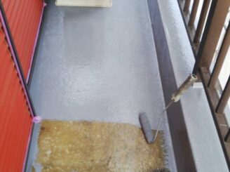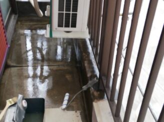 ベランダ高圧洗浄中。既存防水層の汚れや劣化粉を除去しました。 防水材の密着性を高めるための準備工程です。防水は“塗る前”で品質が決まります。