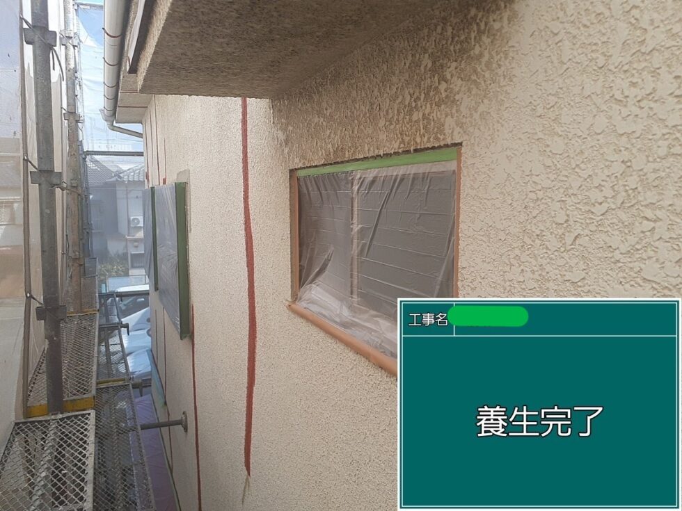 養生完了。塗装箇所以外への飛散を防ぐため養生を実施しました。 仕上がり精度を高めるための基本工程です。