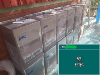 下塗り中。下地と上塗り材の密着を高めるための下塗り工程です。 吸い込みを抑え、耐久性の土台を形成します。