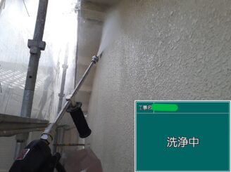 外壁高圧洗浄中。外壁に蓄積した排気汚れや劣化粉を高圧洗浄で徹底除去しました。 密着不良を防ぐための重要工程です。下地処理を甘くすると、数年後に剥離リスクが高まります。