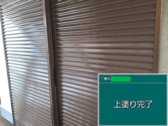 雨戸上塗り完了。 艶のある仕上がりに。建物全体の統一感が生まれました。