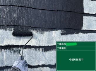 屋根中塗り中。 規定膜厚を確保し、耐候性を高める層を形成します。