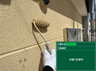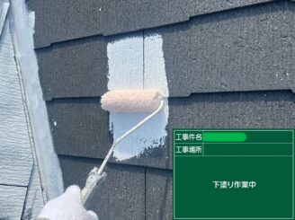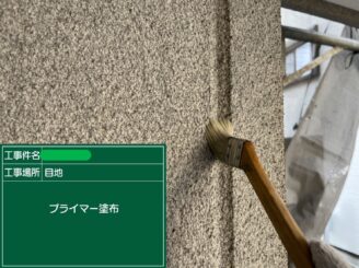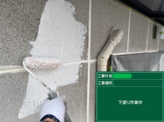 下塗り中。 外壁材との密着を強化し、塗膜の基礎を形成します。