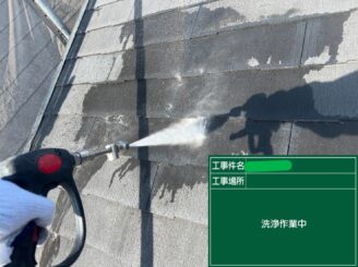 屋根高圧洗浄中。 旧塗膜の粉化や汚れを除去し、下塗り材が密着できる状態を作ります。 密着不足は早期剥離につながるため、洗浄は徹底します。