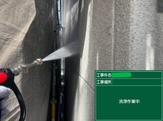 外壁高圧洗浄中。 チョーキングや付着汚れを除去し、塗膜形成の土台を整えます。