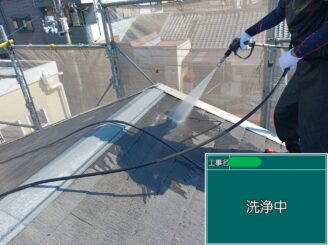 屋根高圧洗浄中。長年堆積した汚れ・苔・旧塗膜を除去し、塗料が密着できる素地状態をつくります。