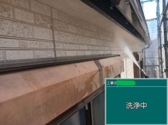外壁高圧洗浄中。 チョーキング粉や排気汚れを徹底除去し、密着不良を防ぐための基本工程です。