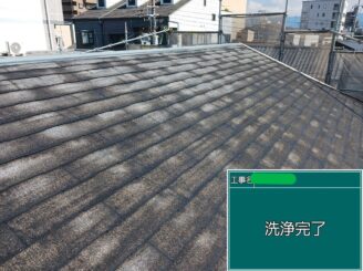屋根高圧洗浄完了。 塗装前の“まっさらな下地”を確保し、ここが甘いと塗膜剥離につながります。