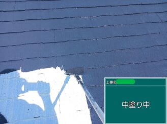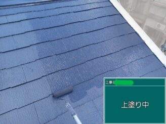 中塗り中。 次に中塗りを行い、塗膜に十分な厚みを持たせます。 単なる“色付け”ではなく、防水性能と耐候性を確保するための機能層を形成する工程です。 ローラー圧と塗布量を管理しながら、均一な膜厚を確保していきます。