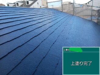 屋根上塗り完了。 均一な塗膜が形成され、防水性と耐久性が回復しました。