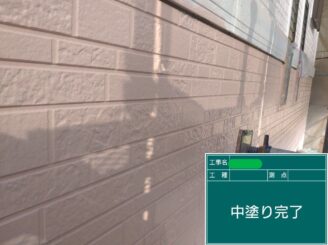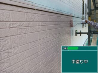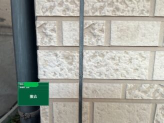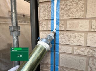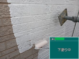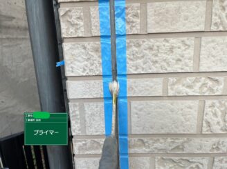 下塗り中。 まずは下塗り材を丁寧に塗布し、外壁材との密着力を高めます。 吸い込みの差を均一に整えながら、後工程の塗膜がしっかり定着する土台を形成します。 この工程を疎かにすると、数年後の剥がれや膨れの原因になるため、最も重要な工程の一つです。