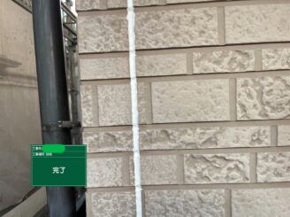 外壁上塗り完了。 塗膜が均一に形成され、防水性と耐候性が安定しました。 補修箇所も自然に馴染み、建物全体が引き締まった印象になりました。 見た目の改善だけでなく、外壁本来の保護機能をしっかり回復させた仕上がりです。